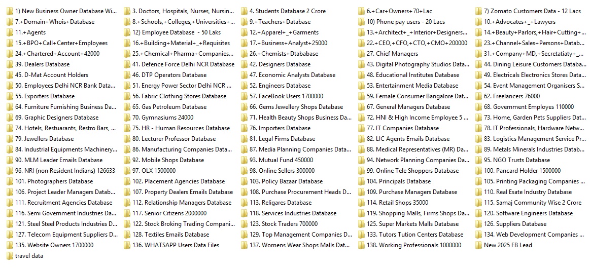 After purchase and download files, I was happy on seeing huge files. After using these for marketing, i confirmed that this database product was from God after my prayer. (Its Gods Gift)